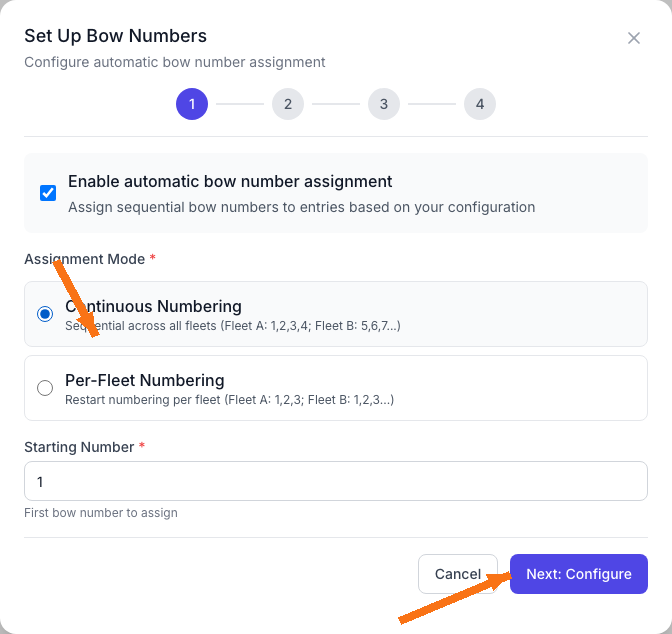 Choose Continuous Numbering if you want unique bow numbers across all selected fleets. Choose Per-Fleet Numbering if each fleet can reuse numbers (Fleet A: 1,2,3… and Fleet B: 1,2,3…).