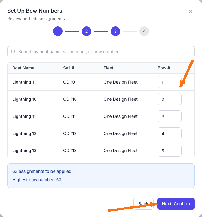 RegattaHub can assign bow numbers automatically using a simple setup wizard. You can also clear all bow numbers if you need to reassign them.